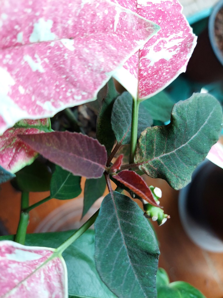 My pink poinsettia started a lot of new dark red growth once the initial wave of blooms died back. I try to only water it once a week, and it gets natural light through the sliding glass door. It’s not under the grow lights, or getting any kind of special treatment. The other one is the centerpiece on the kitchen table.