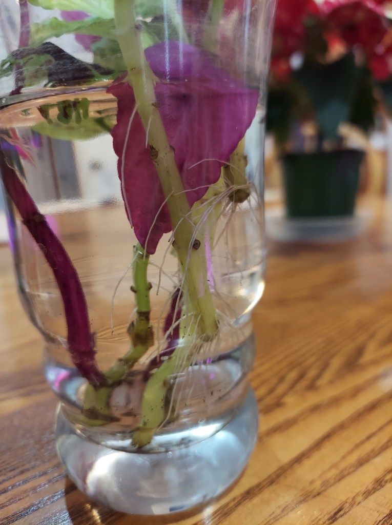 Coleus cuttings well rooted in water. I have now transplanted them to 3-inch seed cells to keep growing.