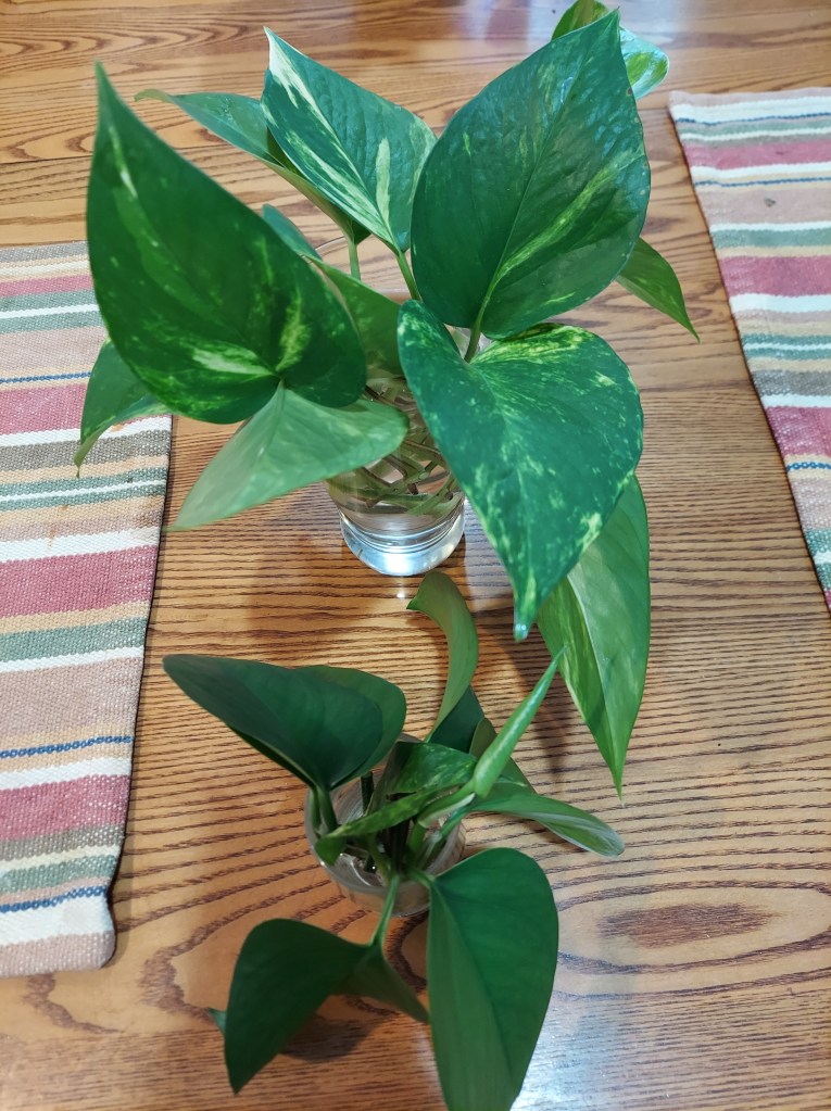 My variegated pothos is doing quite well and has run out of room along the shelf to grow, it’s trying to grow up the corner cabinet. Rather than risk it falling off and breaking the single vine, I have decided to cut it back and propagate it.
