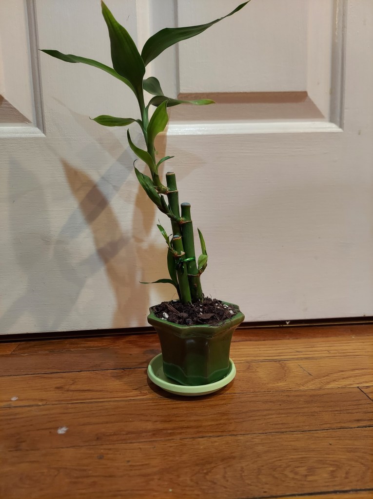 Lucky bamboo, repotted to a green bonsai style pot. It has 5 shoots coming off of 3 stems so I’m hoping it will fill out nicely soon.
