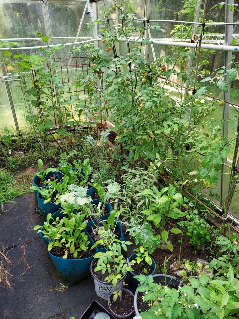 The greenhouse is quite full at the moment, lots of plants in the ground and also in containers. There are a bunch of tomatoes near the bamboo trellis with lemon balm, sage, peppers, nasturtiums, lettuce, kale, marigolds, and rosemary interspersed throughout. My small potted fig trees are in the greenhouse, and a couple are even trying to produce figs. The far right corner has 5 cucumber plants and we need to put in the trellis before they get too much taller. The far left corner has snow peas.