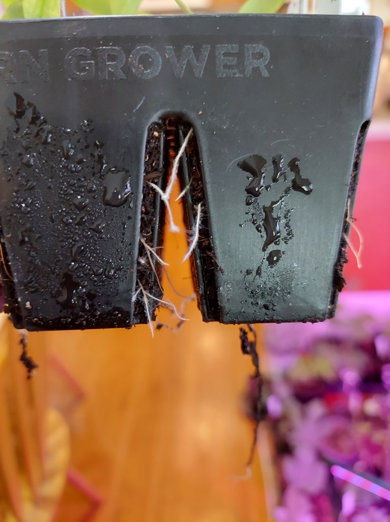 Healthy pepper roots, growing out of the side slits. These are ready to be transplanted to larger pots.