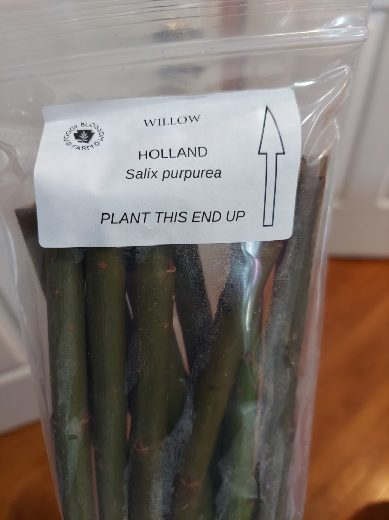 At the beginning of March I ordered willow cuttings from a farm in PA. They had a small stock of their own cuttings available for sale, and I decided to go for it. I ordered 10 cuttings, and they arrived a few days later in the mail. I enjoy weaving with willow and have attended two classes, and want to make more items with willow. However, classes and materials (willow) are expensive, and not locally offered. I’m going to try to grow my own this year.