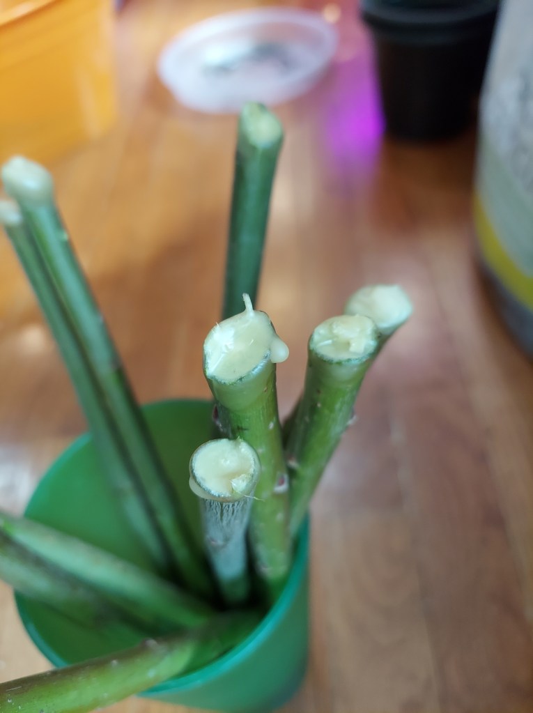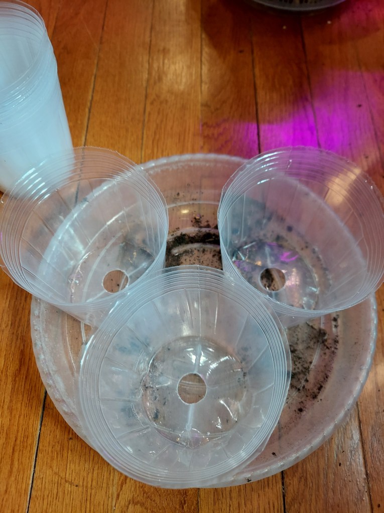 Once again, I used clear plastic containers to plant in, this time I used 6 inch pots, instead of the small cups. These cuttings were quite a bit thicker and longer than my fig cuttings, and I wanted to be able to plant a couple of the growth points to help with the rooting process.