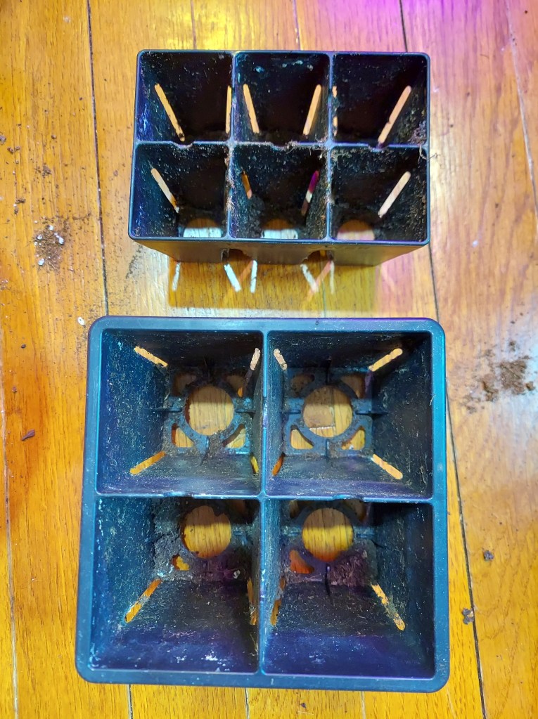 I purchased my trays from Epic Gardening, they are plastic, but really durable and will last a lifetime. They have drainage slits down the sides and large holes in the bottom to make it easy to pop seedlings out for planting. You can also easily monitor the root growth.