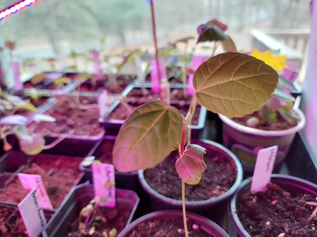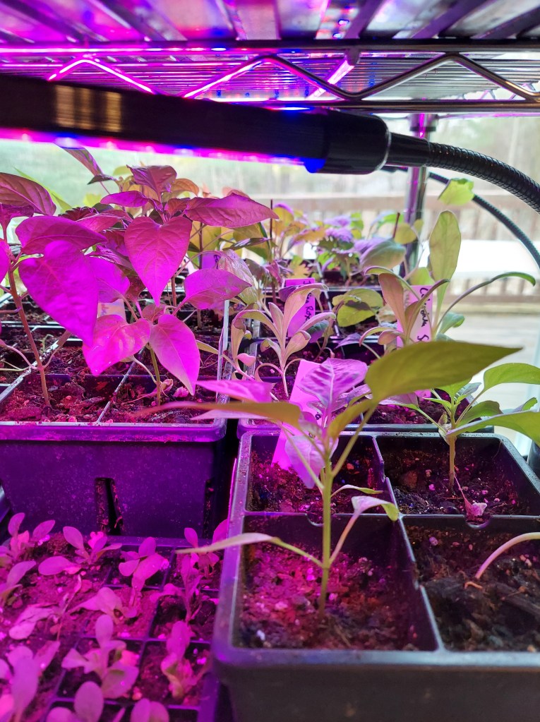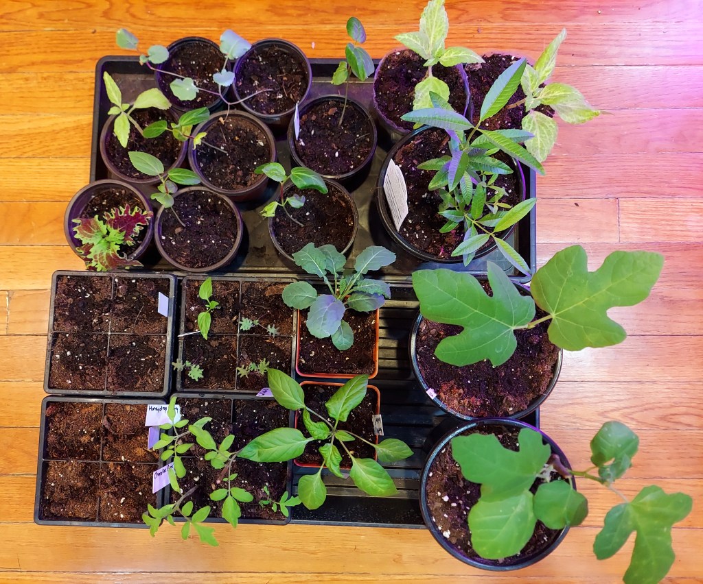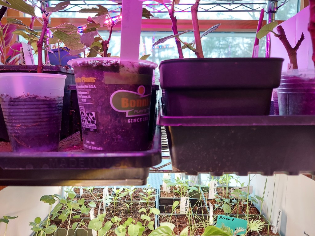 Indoors I’ve been keeping busy the last few weeks. All stages of indoor seed starting are ongoing, from freshly sown pea seeds to potting up one, two, and three-month-old seedlings. These two trays have kale, peppers, broccoli, coleus, figs, and hibiscus, as well as a recently purchased lemon verbena plant. Now the game of Tetris is in full swing as I try to fit as many plants as possible either under the grow lights or by the sliding back door so they can get the natural light.