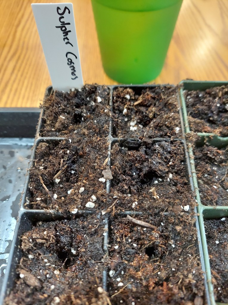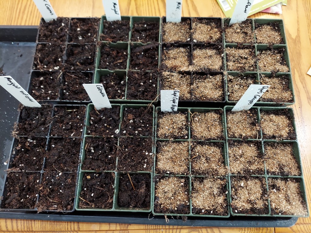 Many tiny flower seeds need light to germinate, so I sprinkled them on the surface of the soil and covered them over with vermiculite (right half of the tray).