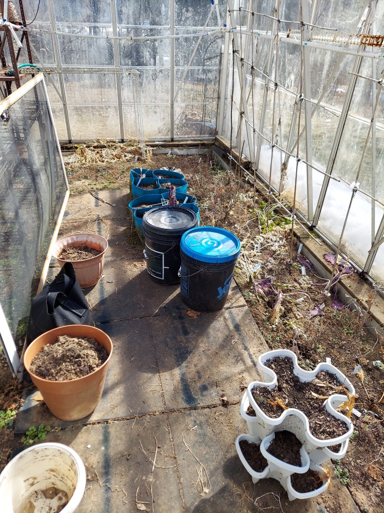 On March 10, we had a very nice spring day so I took advantage to tidy up out in the garden and greenhouse. I removed dead plants, trimmed back the herbs, pruned the fruit trees slightly, and weeded in the greenhouse. I filled several buckets with material for the compost pile. I enjoyed being able to spend time outside without wearing a jacket since the greenhouse was about 80 degrees.
