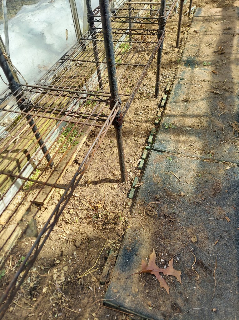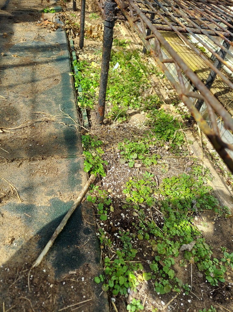 The lefthand side of the greenhouse floor, which is under shelves, was full of weeds. Took a while to clear it out, I also had to trim back a messy oregano plant that had gone to seed last fall.