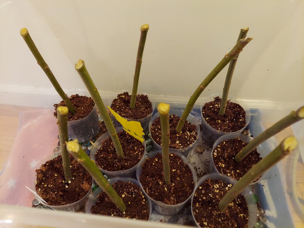 The cuttings were planted on March 12, and left in the tote with the lid just cracked for the first few days. I misted them with water once to make sure the top of the soil wasn’t drying out. In less than a week there was visible bud growth as they broke dormancy and started growing. I did spot tiny roots around the edge of a couple of the containers, so I think they are going to all make it and do just fine.