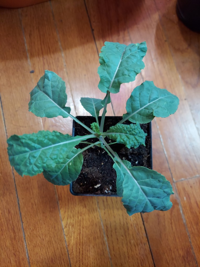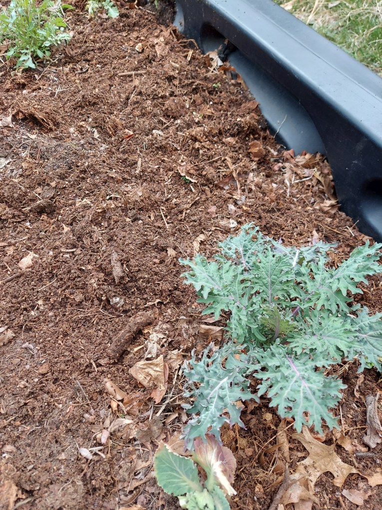This is an overwintered kale which has grown several new leaves this spring already. I should be able to get a few small harvests off of it before it bolts and goes to seed in late May. Kale is a biennial plant, so it naturally will produce seeds in its second year. I may leave it to flower for the pollinators.