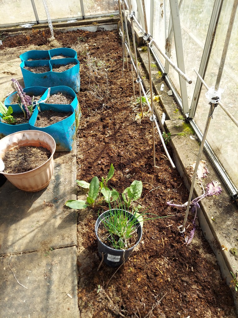 The sorrel and chives are putting on lots of fresh growth due to the warmth in the greenhouse. The sad looking kale on the right actually had several new leaves coming off the base of the stem. I trimmed the upper part off, but should get a few baby leaves for salads in a couple weeks. After I spread the compost, I direct sowed some lettuce, spinach, and pea seeds in the greenhouse.